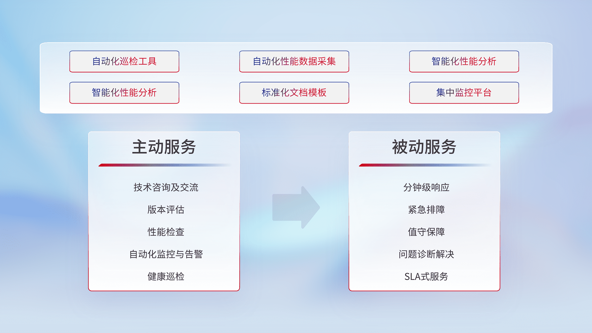 智能化工具和标准化文档,,,,保障服务质量,,,提供主动服务(包含技术咨询、、、版本评估、、性能检查、、自动化监控与告警、、、、健康巡检)和被动服务包含(分钟级响应、、、、紧急排障、、值守保障、、问题诊断解决、、、、SLA服务)。。。。